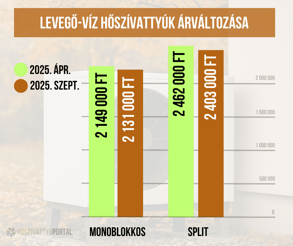 A Hőszivattyú Portál által végzett árfigyelés szerint 2025 áprilisa és szeptembere között az árak átlagosan 1,9 %-kal csökkentek. Bár az árak döntő többsége változatlan maradt, a vizsgált készülékek 22%-ának csökkent az ára, és csupán 4%-uk került többe, mint tavasszal.